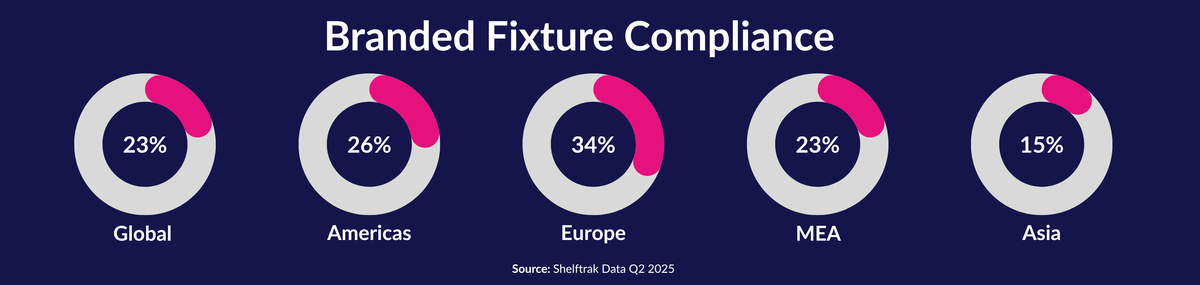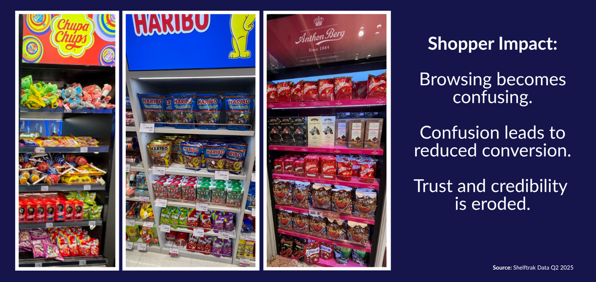Shelftrak analysis of 995 branded confectionery fixtures across approximately 70 global travel retail stores reveals that nearly 23% of branded displays contain competing supplier products.